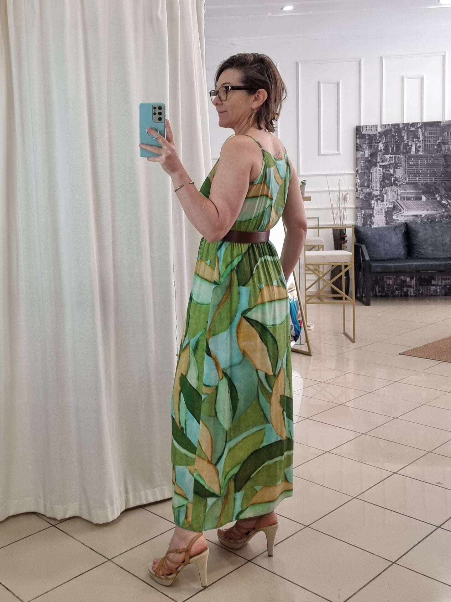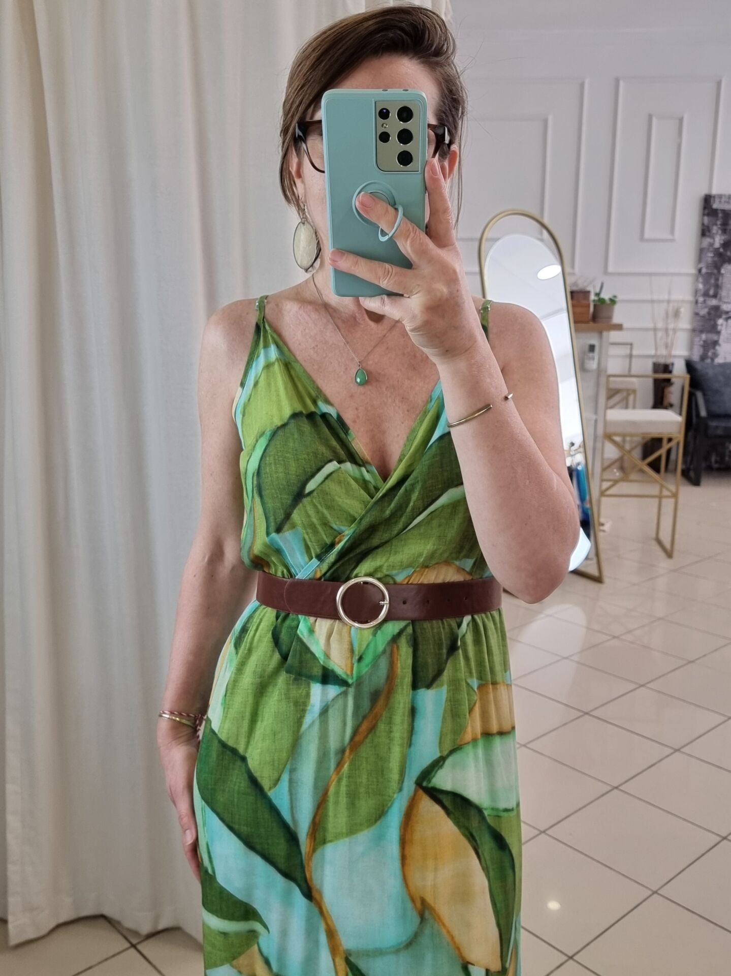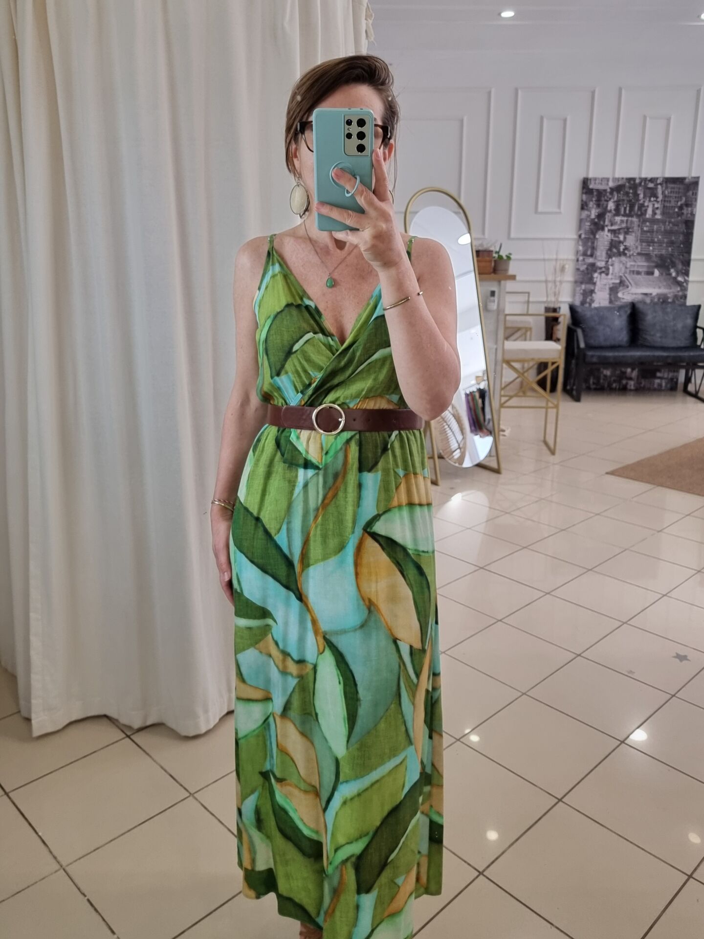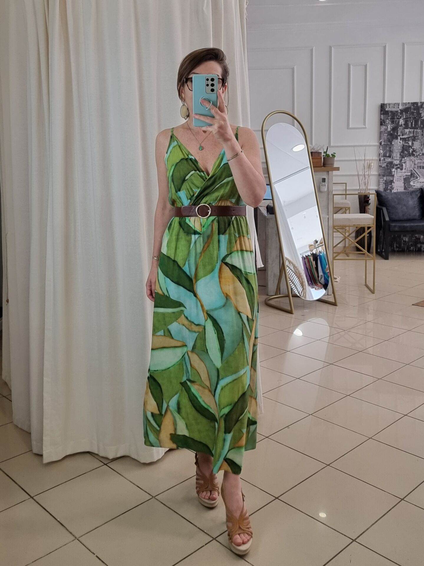 %100 Viskon Yeşil Desenli Uzun Elbise