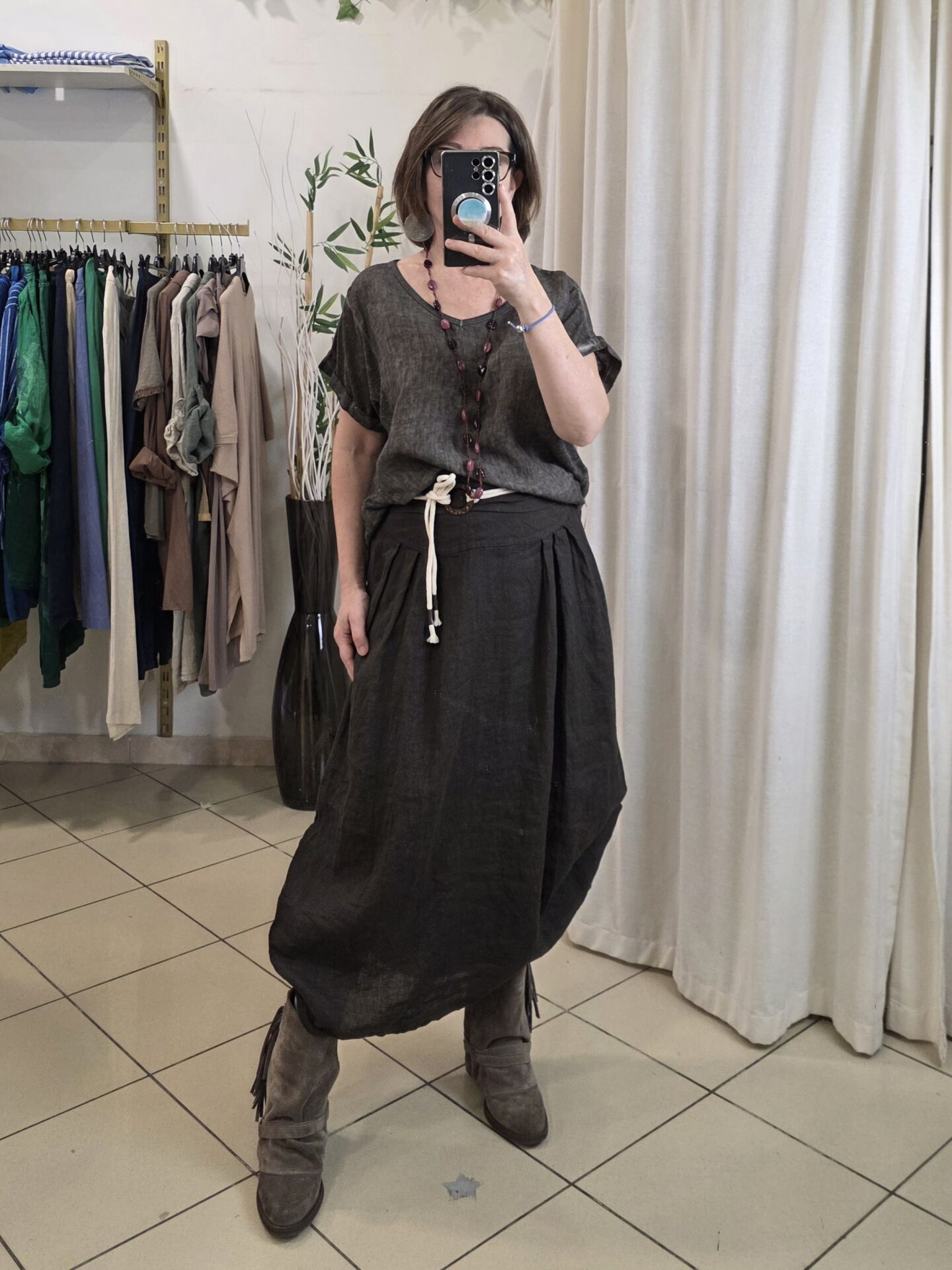 Yıkamalı oversize kahverengi keten bluz.