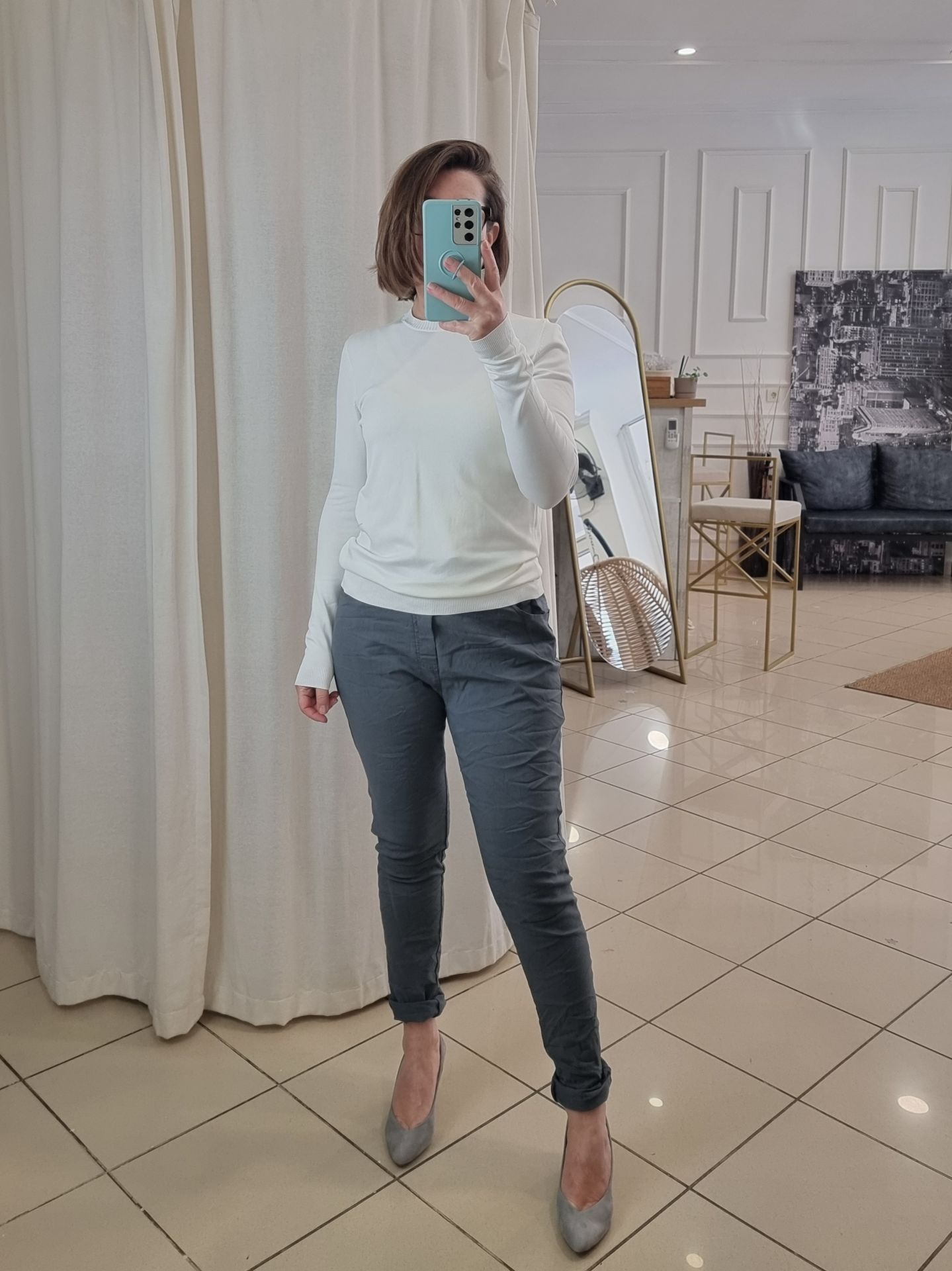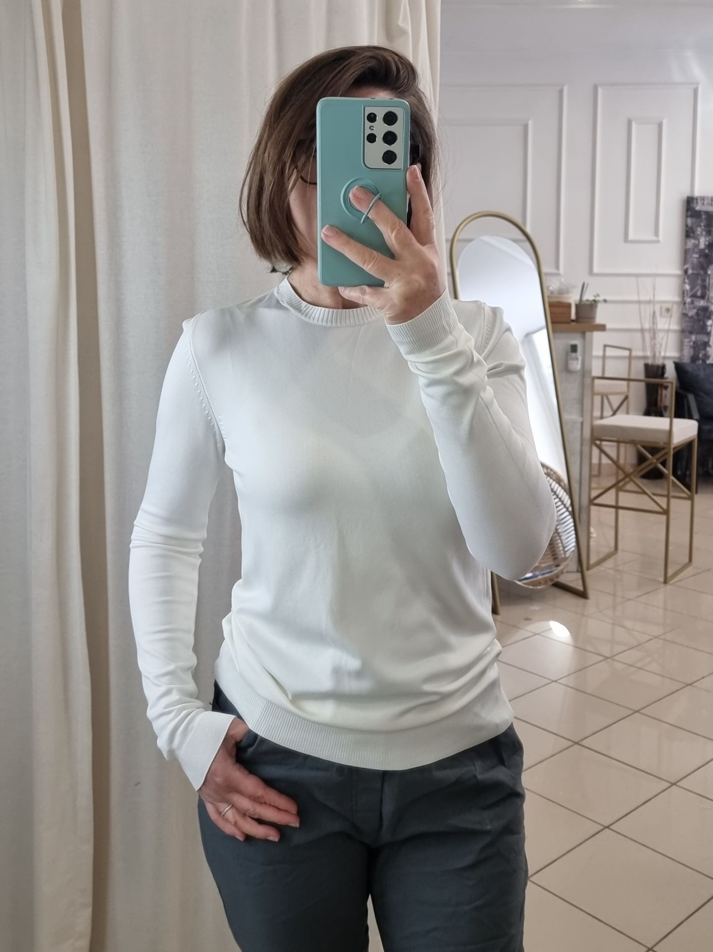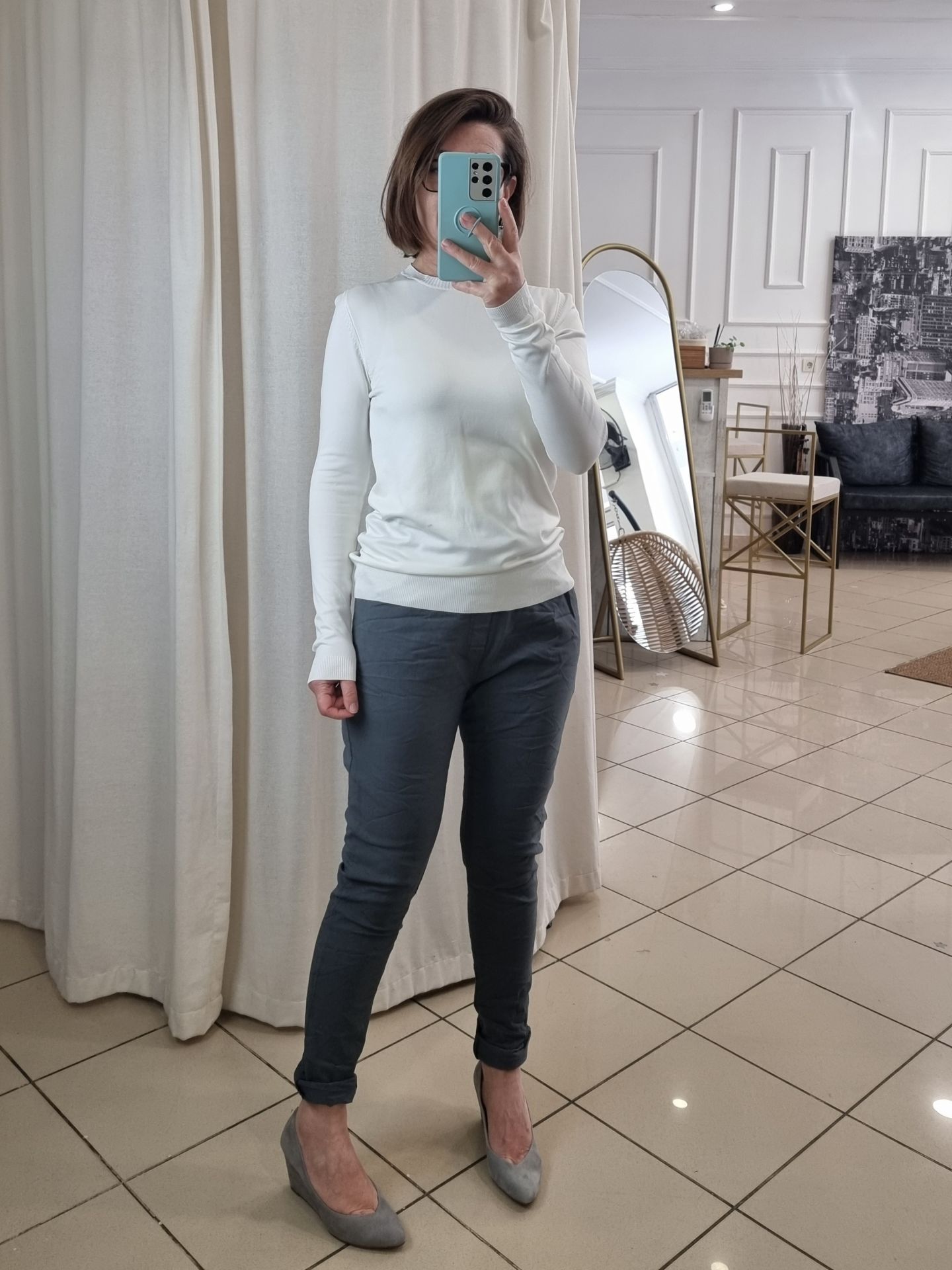 Soğuk ipten üretilen bu beyaz basic triko bluz, zarif ve sade çizgileriyle her kadının gardırobuna uyum sağlayacak joker parçalardan biridir. Yumuşak dokusu ve esnek yapısı sayesinde gün boyu konfor sunarken, sade formu sayesinde ister günlük kullanımda ister ceket altı kombinlerde rahatlıkla tercih edilebilir. Hafif parlaklığıyla dikkat çeken bu basic triko, S ve M beden uyumuyla üzerine oturur ama sıkmaz. Şıklığı sadelikte arayan kadınlar için oldukça kullanışlı bir seçenek.